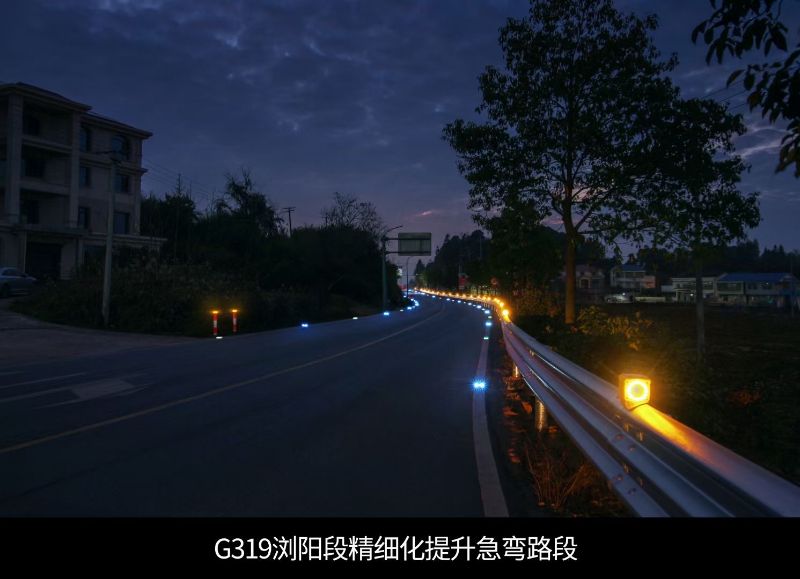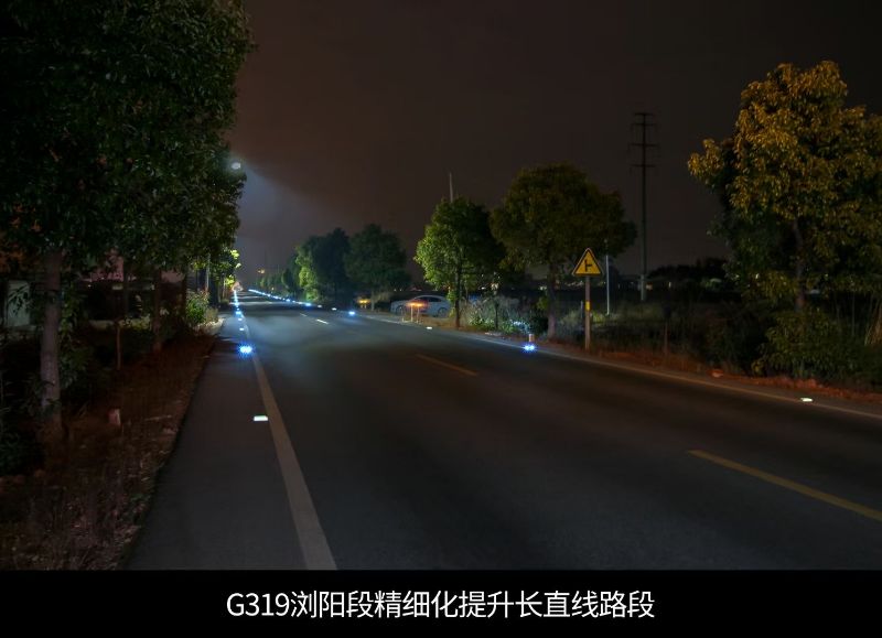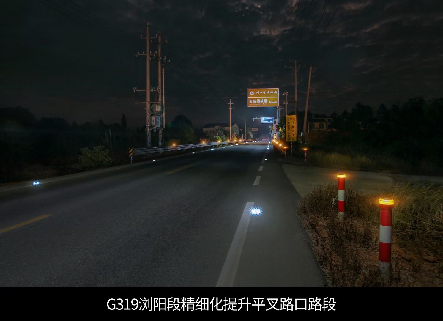 與會人員參觀“智能蓄能自發光反光太陽能交通標識”展區和G319瀏陽段國省干線安全設置精細化提升示范工程夜間效果“四新技術”展示。